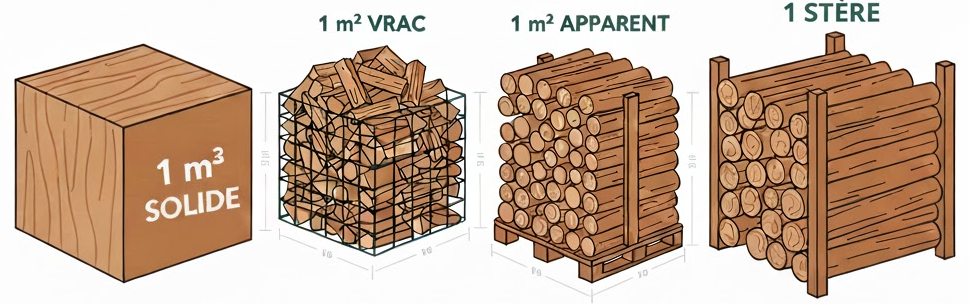 | m³ solide | stère | m³ apparent | m³ vrac |